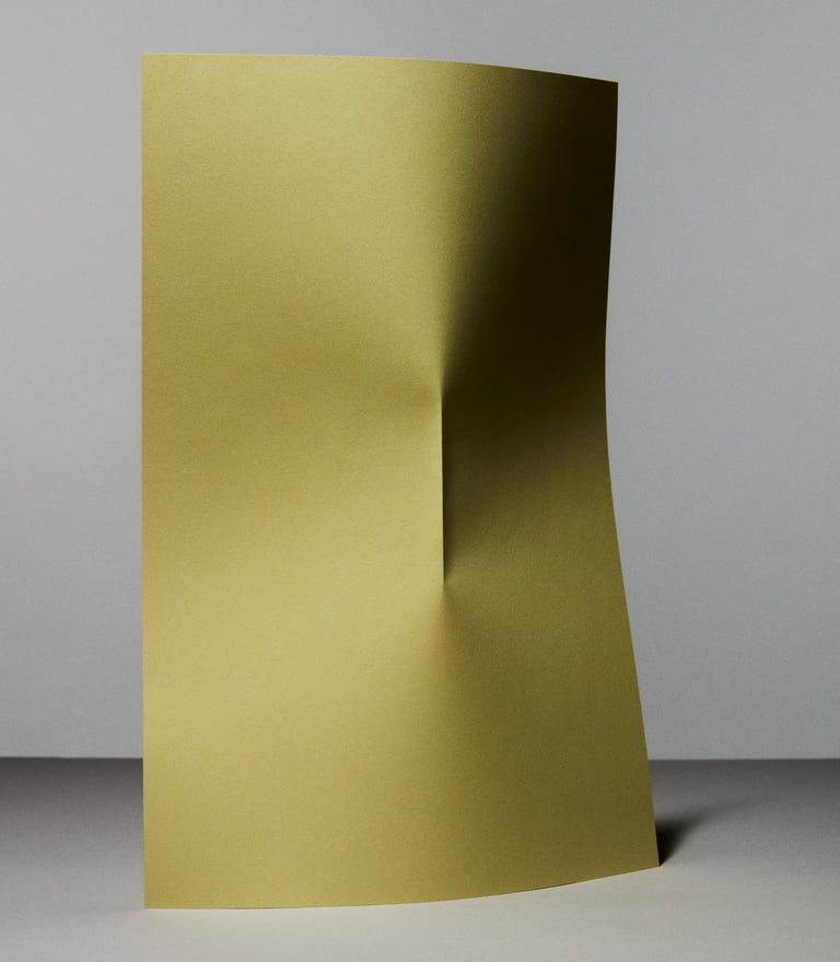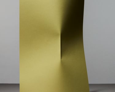 His work explores the threshold between existing and being. Through a single fold impressed into a sheet of paper, he transforms a flat surface into a vertical presence, revealing the moment when inertia becomes a position in space.
